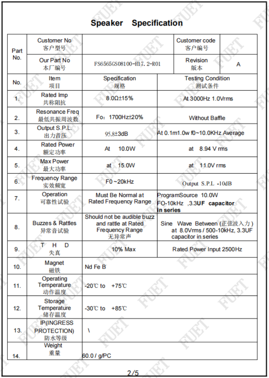 阻抗 | 8.0Ω±15% | At 3000Hz 1.0Vrms |